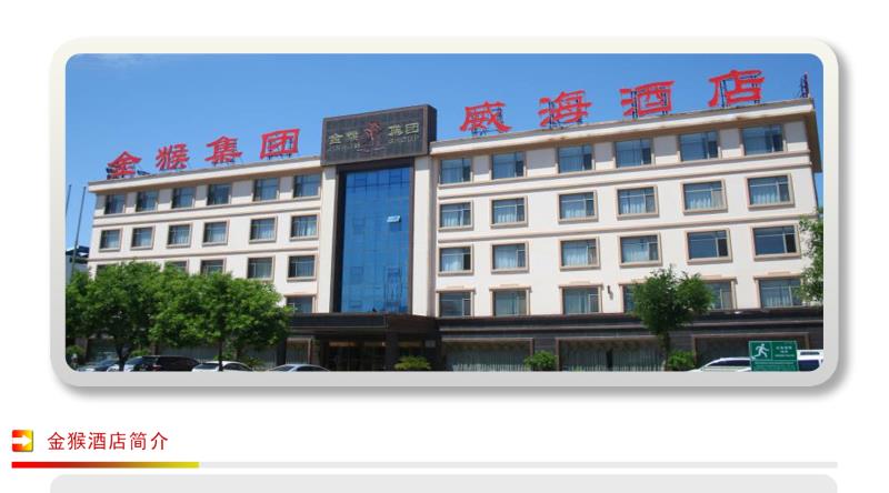★金猴集團威海酒店座落于威海高技術產業開發區丹東路88號,是金猴集團下設的全資子公司,酒店于05年6月營業,是以餐飲、客房、會議為主體的掛牌三星級旅游飯店,同時擁有“全國工業旅游示范點”、“黨政機關定點接待飯 店”、“山東旅游服務名牌”、“威海市優秀旅游飯店”四項行業榮譽。