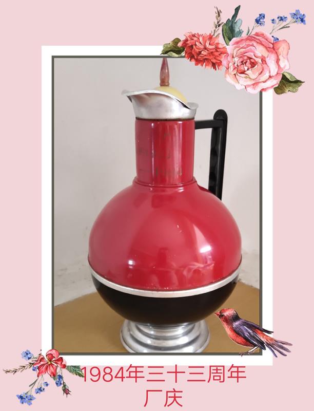 記憶一:暖水瓶——1984年金猴創立33周年時企業給職工發的紀念品。這是一件造型別致的暖水瓶,由壺蓋、壺身、壺座、壺把組成,壺蓋類似于蒙古帽,壺身形狀類同瓷器中的天球瓶。整個壺體由紅黑銀三種顏色互相襯托,顯得端莊大氣又不乏時尚感。以八十年代初期的生產技術水平,這種工藝造型的暖水瓶已經很超前了。由于該紀念壺距今已近四十年,當時工廠規模小,職工只有幾百人,只發給“正式工人”和“亦工亦農”,所以數量不多,且又是生活必需品,報廢率高,存世量少,具有一定的收藏價值。