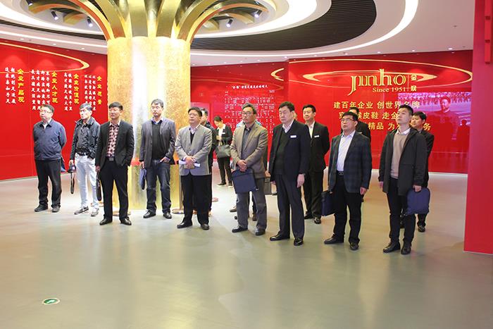 省“千名干部下基層”服務隊一行走進鞋業工業園生產車間和膠東(威海)黨性教育基地金猴展陳館,詳細了解公司生產經營、轉型升級、軍民融合及展陳館建設情況,對公司的技術研發、品牌建設、軍民融合工作及金猴皮鞋、皮具的品質給予了充分肯定和高度贊揚。