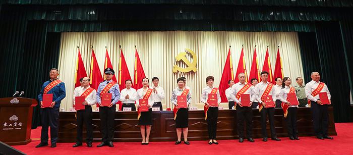 7月1日,威海市慶祝中國共產黨成立98周年大會在東山會堂召開,市委書記王魯明出席大會并講話,市委副書記張宏偉主持大會,市領導王學文、高旭光、張宏偉、王亮、傅遜、侯世超、劉運、戴龍成、傅廣照、劉廣華、鄒積軍等出席。會上宣讀了《中共威海市委關于命名表彰優秀共產黨員、優秀黨務工作者和先進基層黨組織的決定》,金猴集團威海服裝有限公司總經理王濤等40名同志被授予“威海市優秀共產黨員”稱號,市領導為獲獎者頒發榮譽證書。
