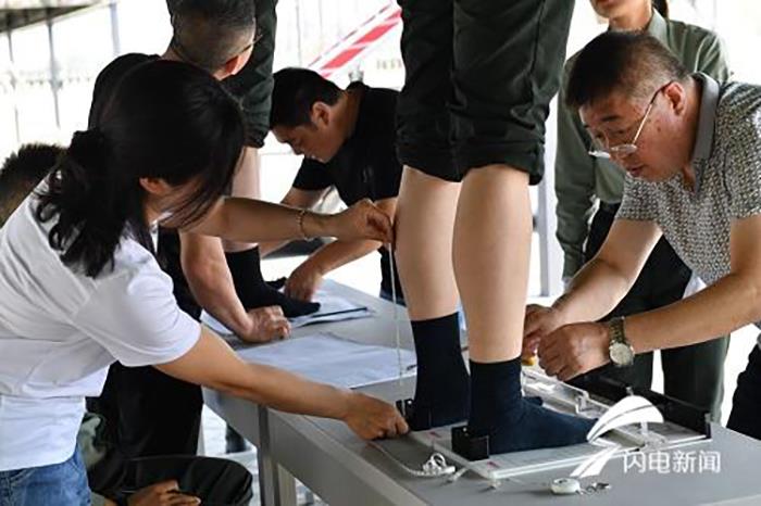 “剛開始她們集結的時候,初期量一遍,然后訓練一段時間,腿腫了,得再量一遍,再過一段時間,腿又消腫了,又量了一遍,然后正式上閱兵場之前,我們又量了一遍,所以一共是4遍?!倍麻L柳富林說,企業要給每個人做四雙不同尺碼的鞋,才能保證受閱隊員在每一個訓練階段都穿上了合腿合腳的鞋子。