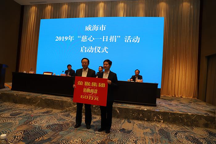 2019年11月1日,威海市2019年“慈心一日捐”活動啟動儀式在東山賓館舉行,集團公司紀委書記、工會主席鄒曉伍代表金猴集團向市慈善總會捐款60萬元。