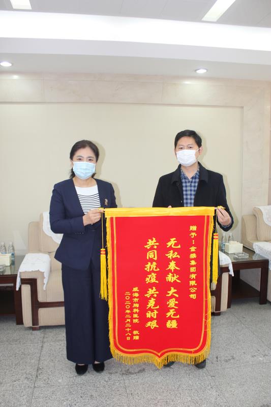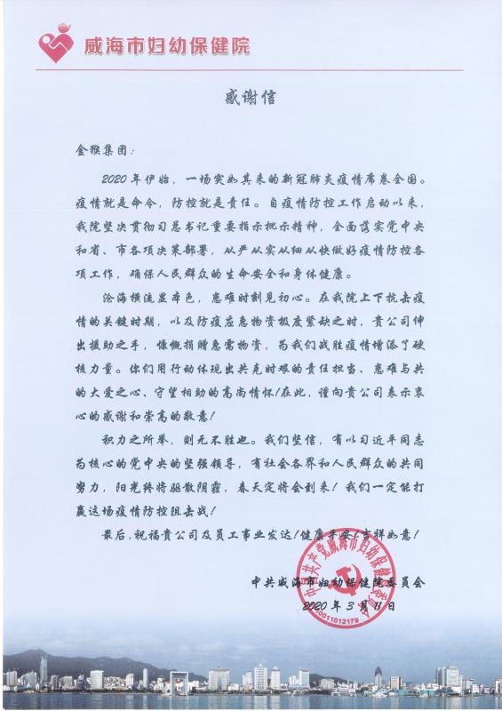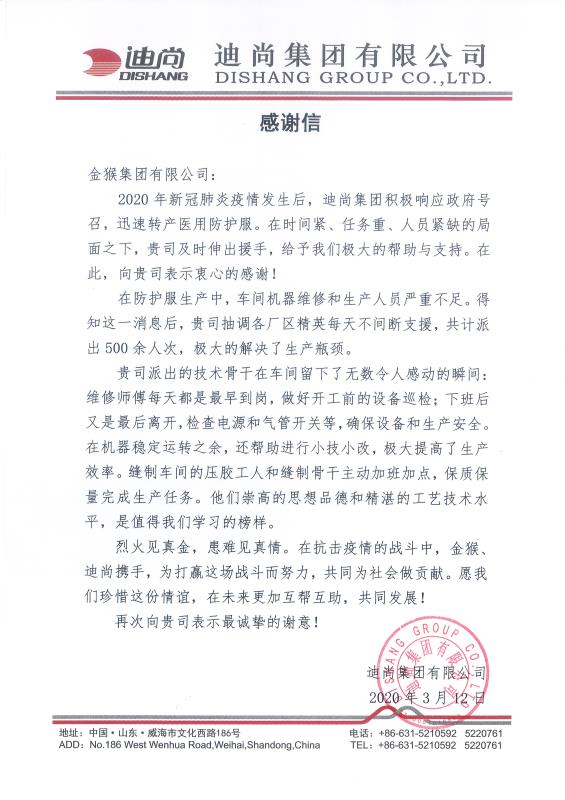 近兩月來,威海市委市政府及52市主要領導先后給集團董事長打電話稱贊金猴集團在抗擊新冠病毒戰役中的慈心善舉,婦幼保健院赴武漢醫療隊、威海胸科醫院、環翠樓街道商圈黨委、迪尚集團等單位還給我公司送來感謝信和錦旗,對我公司積極出錢出人出物資全力支持部隊、地方政府、衛生系統打贏疫情阻擊戰表示欽佩和感激。