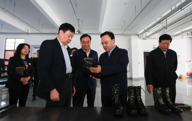 市委副書記、代市長閆劍波(右二)在集團黨委書記、董事長柳富林(右四)的陪同下視察鞋業生產車間