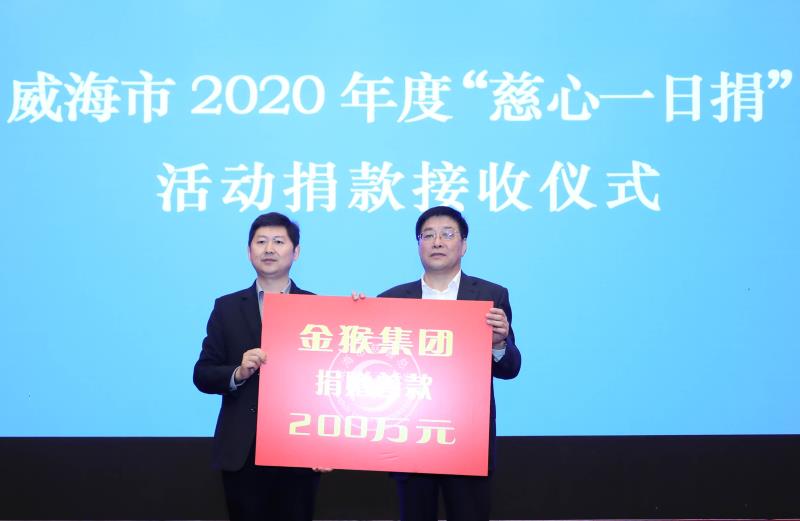 頒獎典禮結束后,威海市2020年度“慈心一日捐”活動捐款儀式舉行,集團紀委書記、工會主席鄒曉伍代表公司向市慈善總會捐款200萬元。